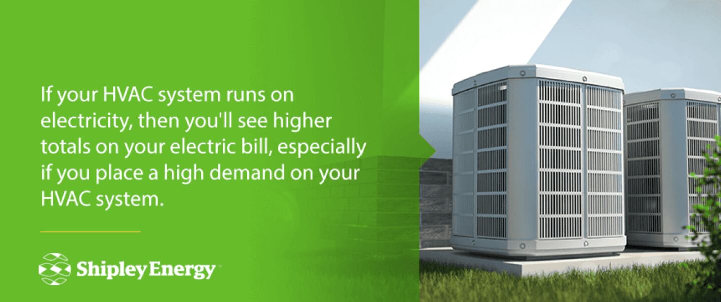 For the average single-family household, heating accounts for up to 45% of annual utility costs, and cooling makes up 9%. If your HVAC system runs on electricity, then you'll see higher totals on your electric bill, especially if you place a high demand on your HVAC system. This is one of the main reasons your electric bill will fluctuate seasonally. During harsh winter or scorching summer months, you can expect to use a lot more electricity for heating or cooling than you'll use during milder times of the year.