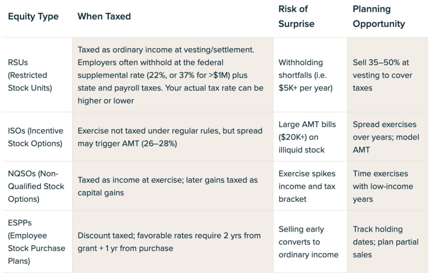 For some tech employees, equity compensation can make up 30%-70% of total income. Mismanaging the tax rules can easily cost five or even six figures in surprise bills, penalties, or missed opportunities. With proper planning, you can turn equity into long-term, tax-efficient wealth.