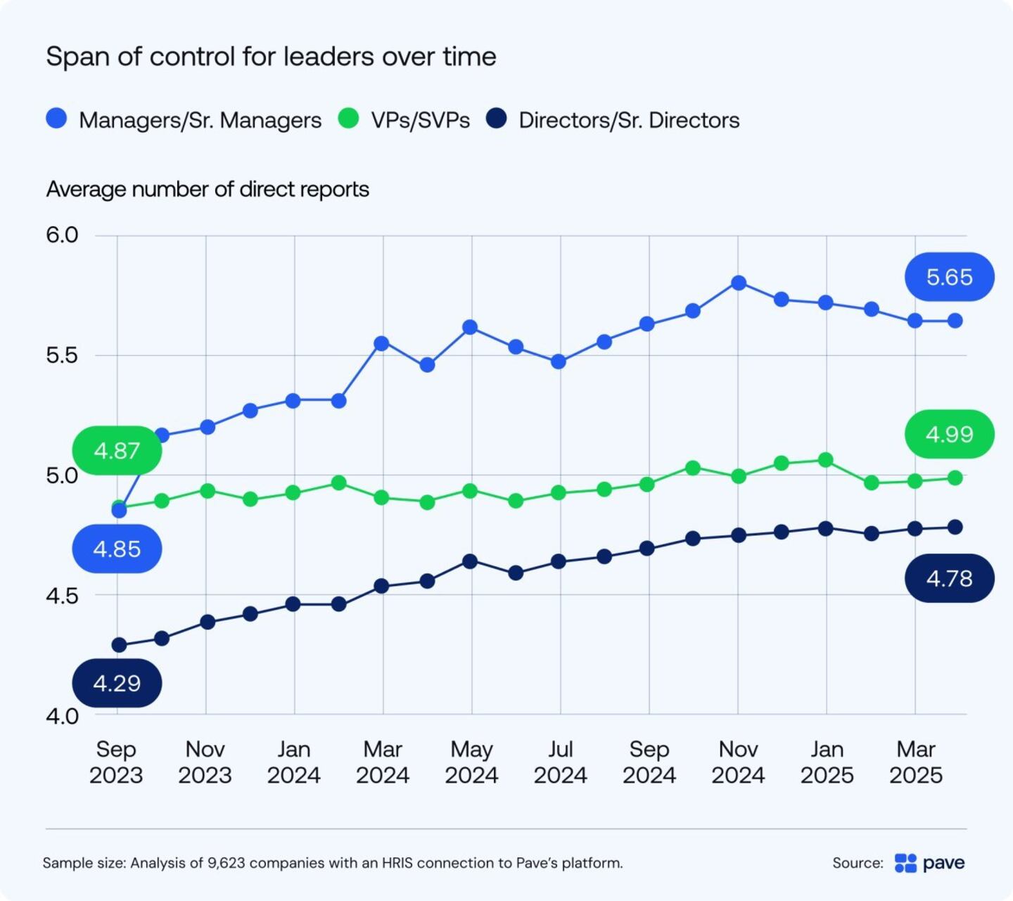 To assess this trend, Pave examined span of control benchmarks—a measure of how many people report directly to managers. Among 180,000 managers, directors, and executives tracked over an 18-month period across a consistent set of technology companies, spans of control are climbing.