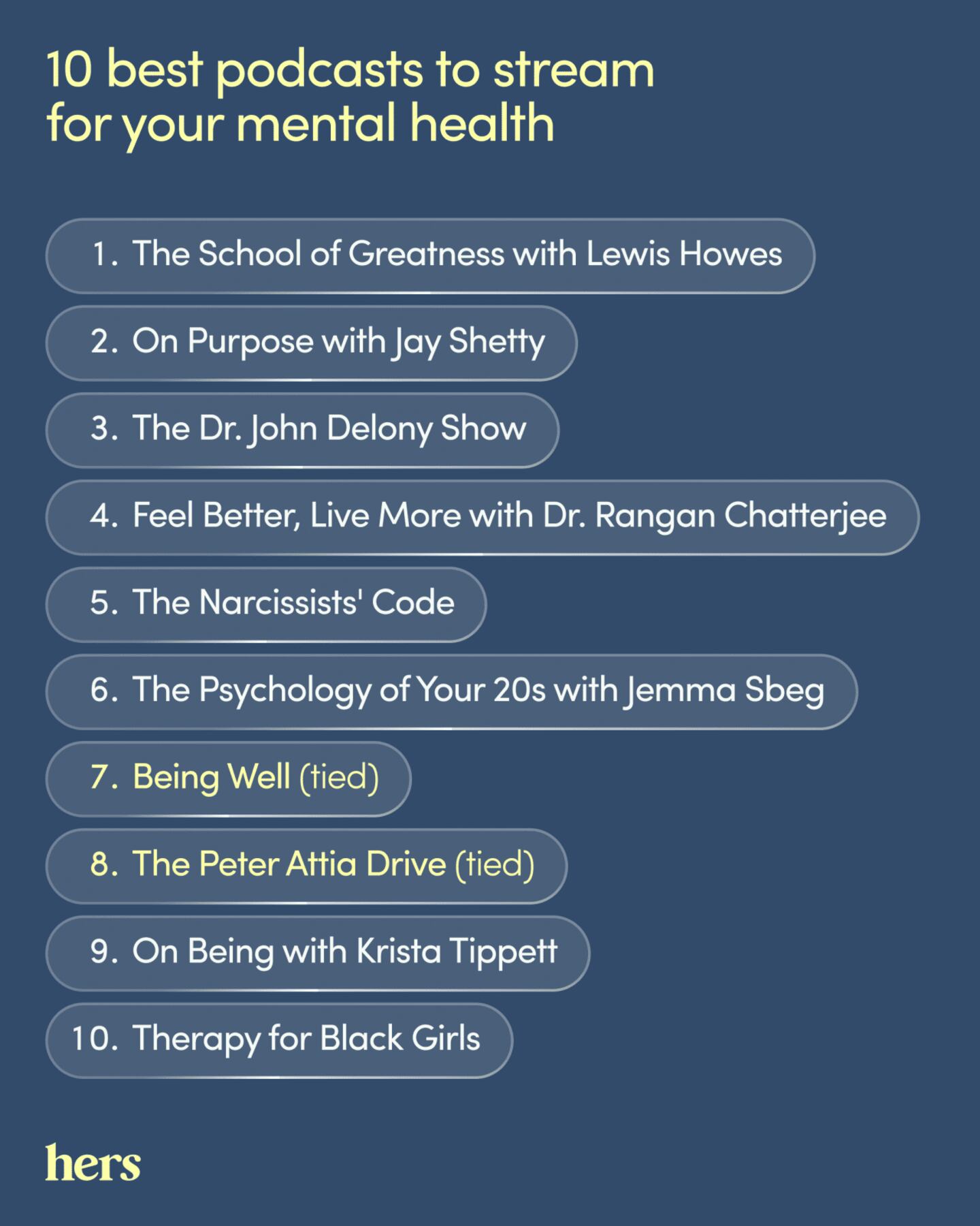 Hers gathered 30 popular podcasts based on mental health category recommendations on Apple Podcasts and Spotify. From there, we ranked each one based on three categories: average reviews on both podcast platforms, total number of reviews, and total episodes.