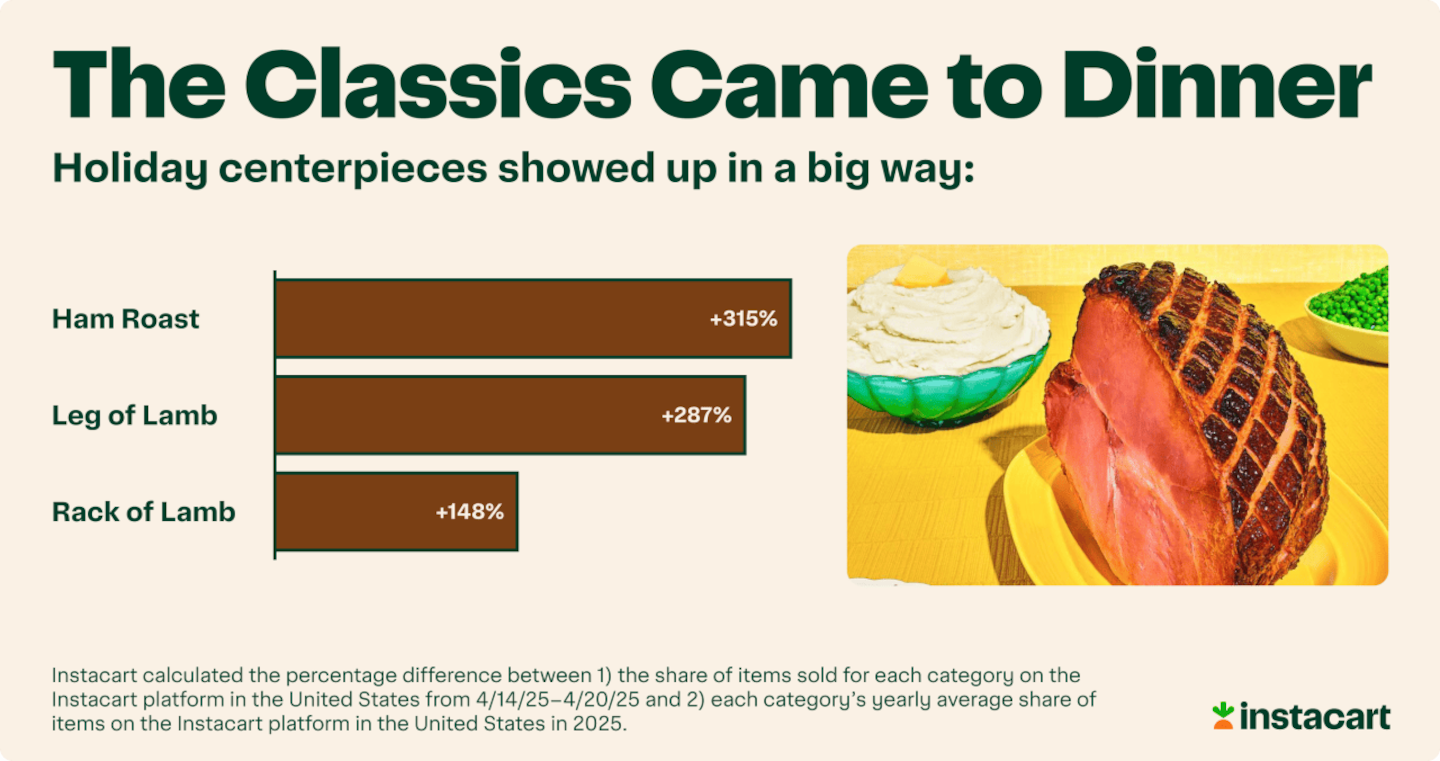 Looking at the week leading up to Passover (April 7-13, 2025), traditional Seder essentials rose sharply compared to their typical yearly share with matzah (+1,239%), matzo ball mixes (+673%), gefilte fish (+742%), and horseradish root (+1,120%).