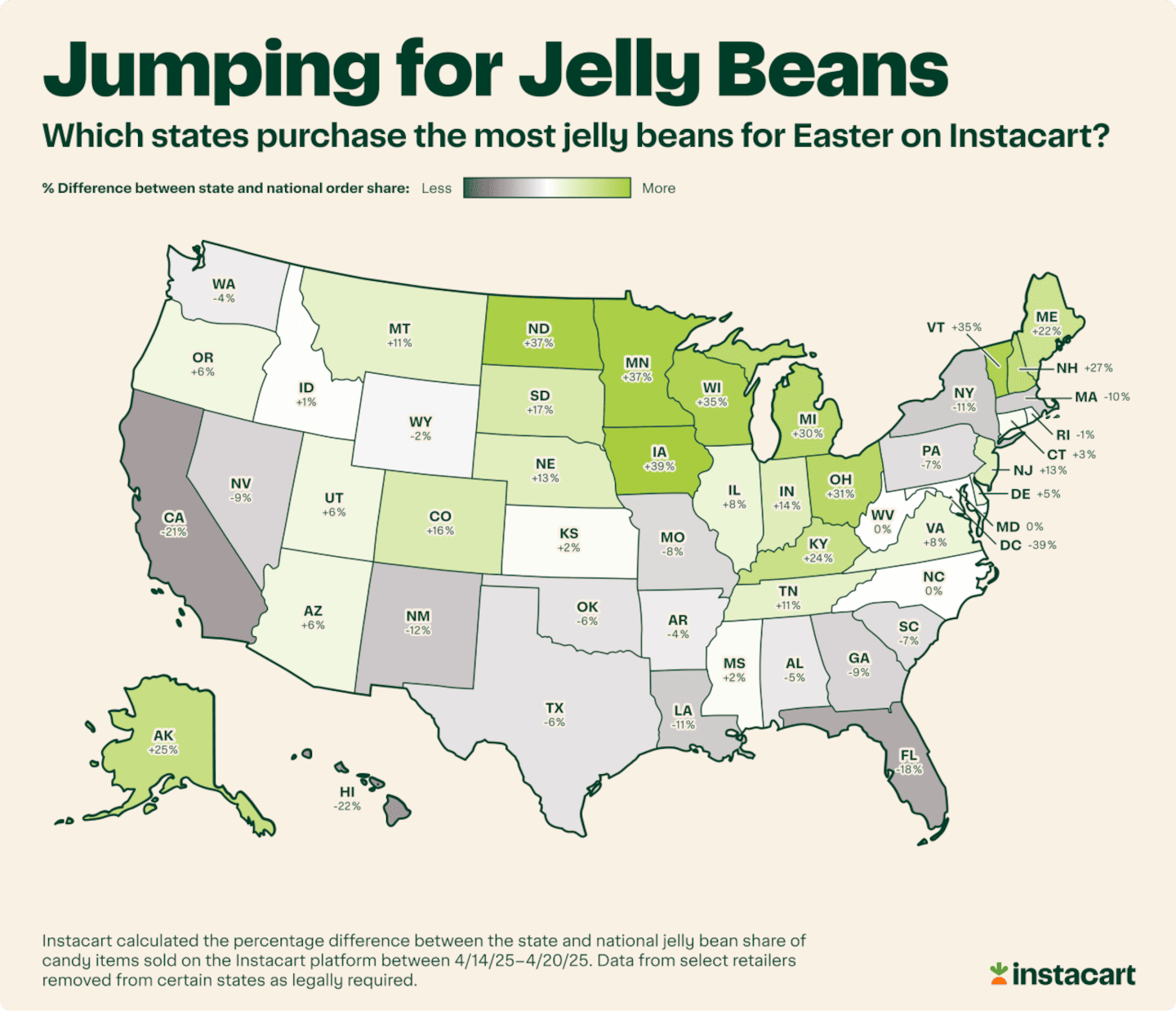 In these states, jelly beans made up a significantly larger share of candy purchases than the national average, reinforcing their status as an Easter essential.