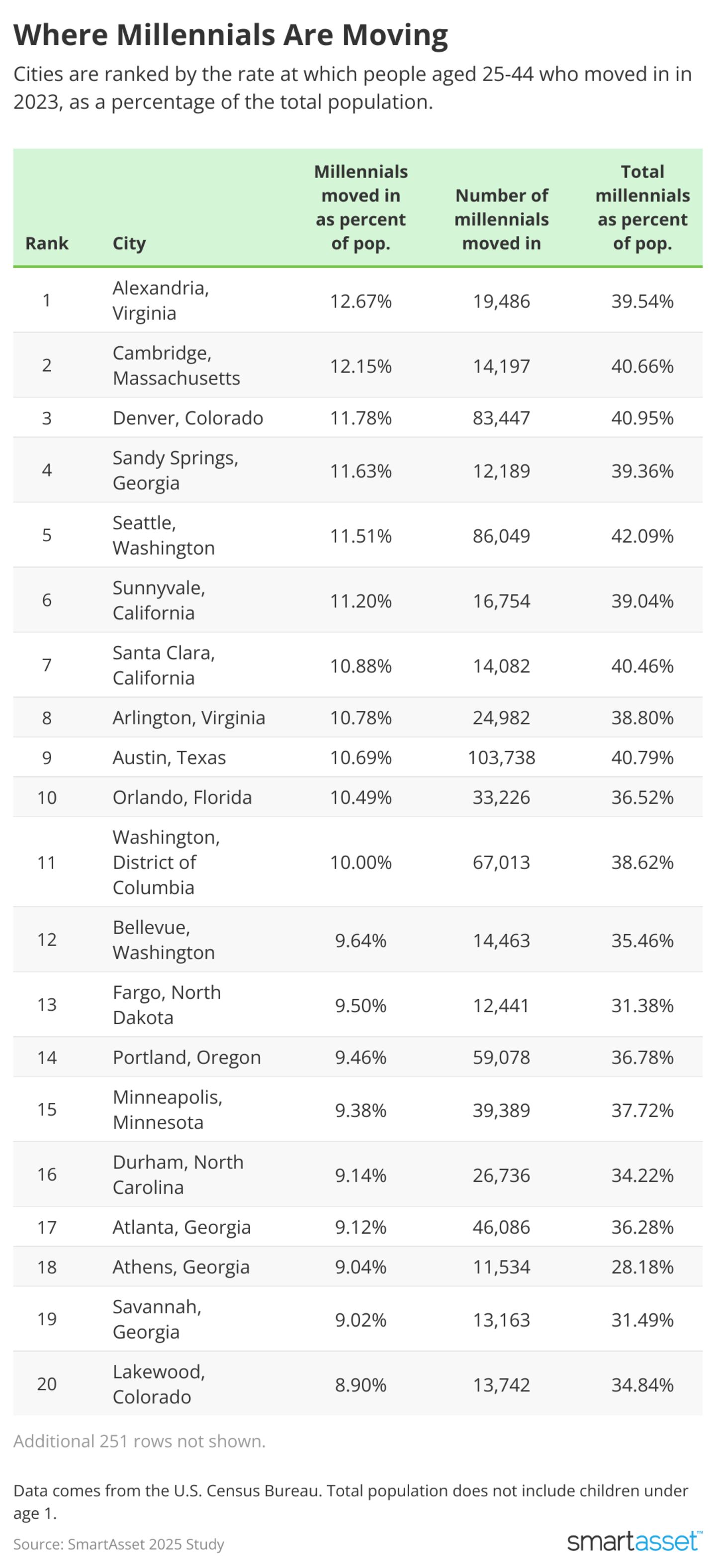 - In these two cities, millennials who have recently moved in make up over 12% of the population. Alexandria, Virginia, saw the highest influx of millennials relative to its population, with 12.67%—or 19,486— moving in during 2023, approximately 46% of whom came from out of state. Cambridge, Massachusetts, ranked second, with millennials making up 12.15% of new residents, or 14,197 people, 39% of whom relocated from outside the state.