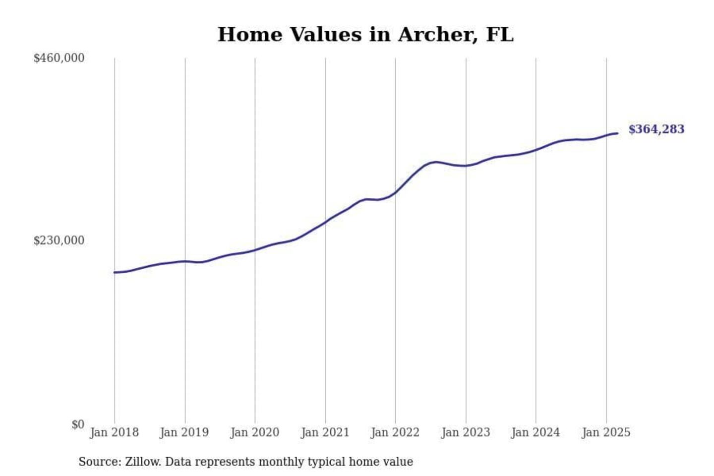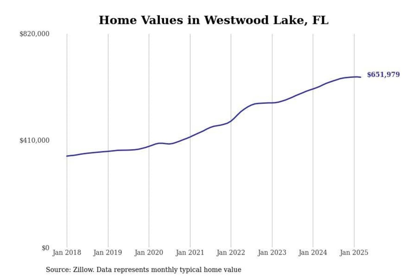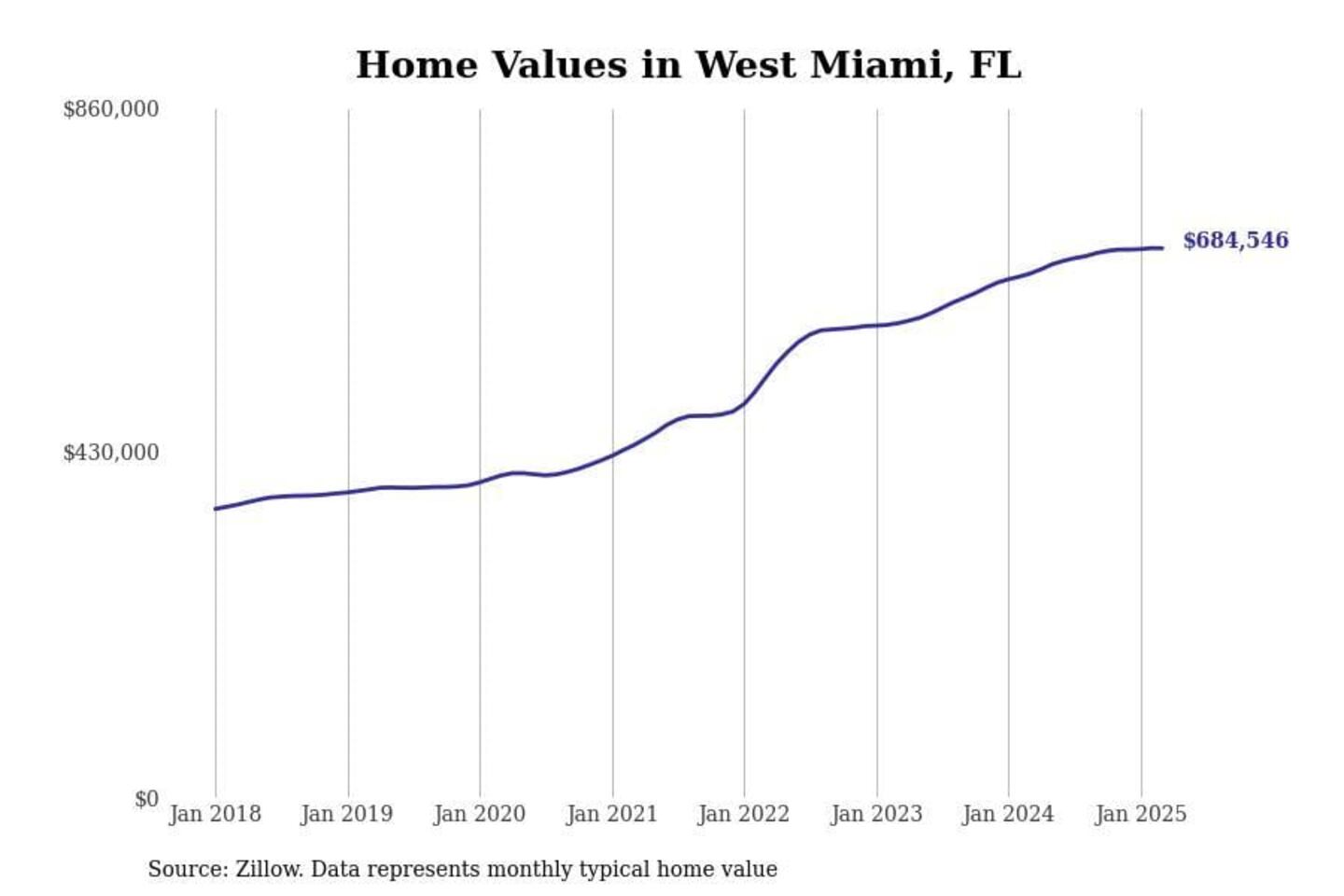 Stacker compiled a list of cities with the fastest-growing home prices in Florida using data from Zillow. Cities are ranked by the dollar change in the Zillow Home Values Index for all homes from the 12 months ending March 2025. The charts in this story were created automatically using Matplotlib. Data was available for 50 cities and towns in Florida.