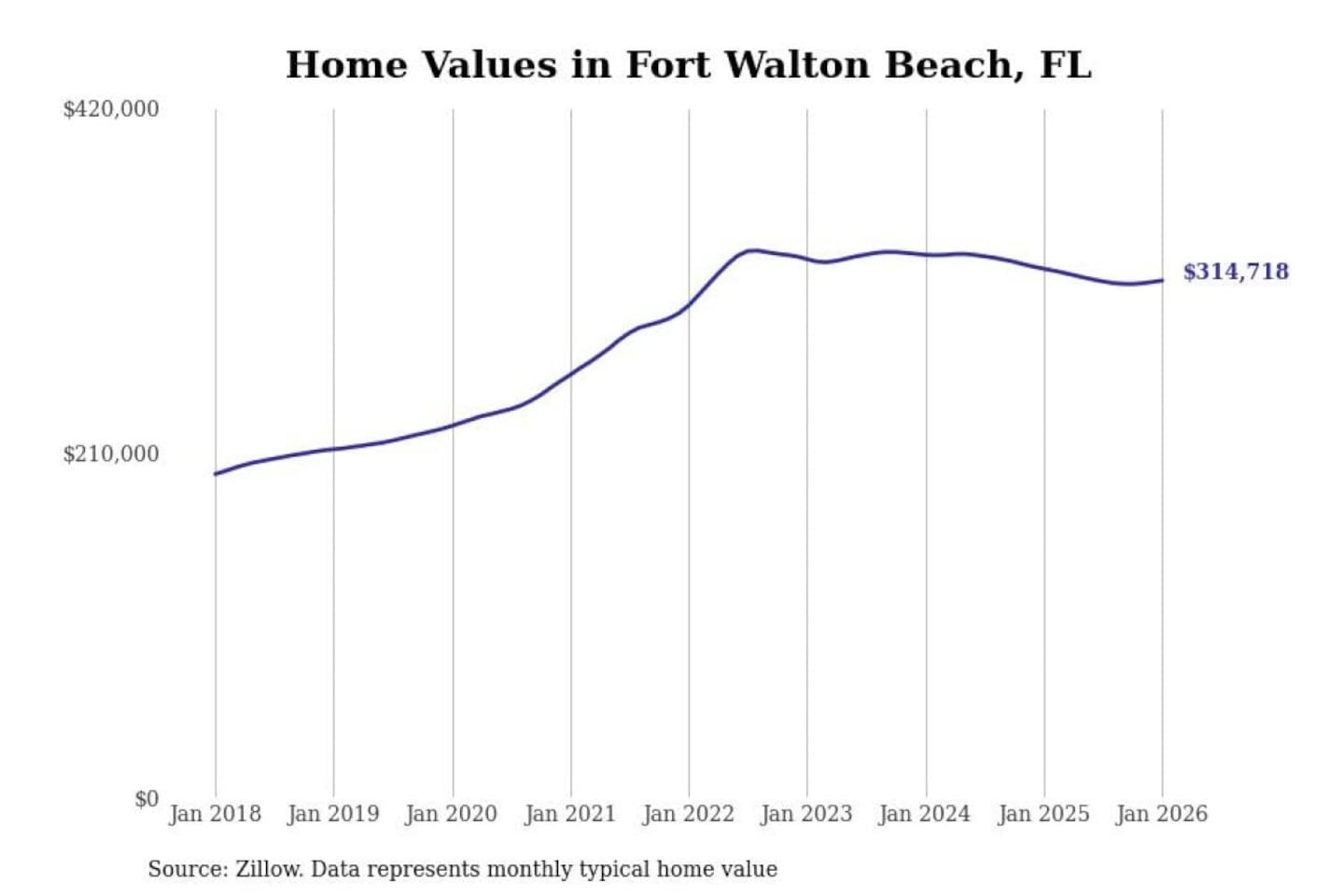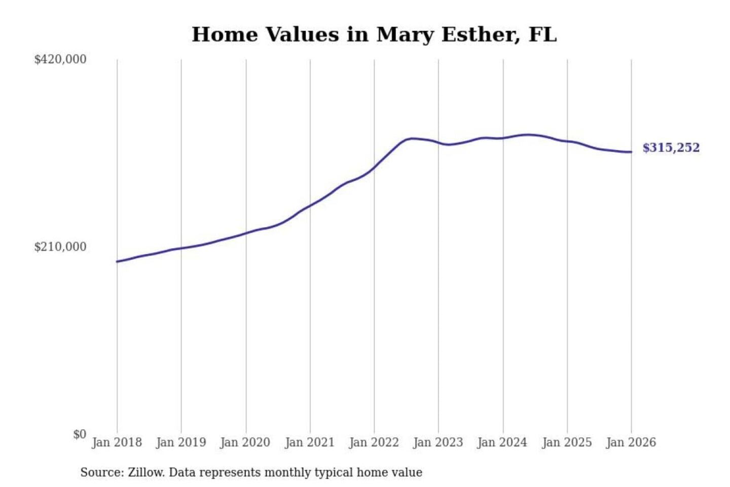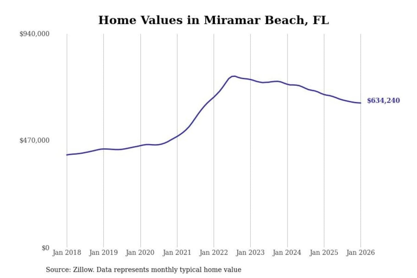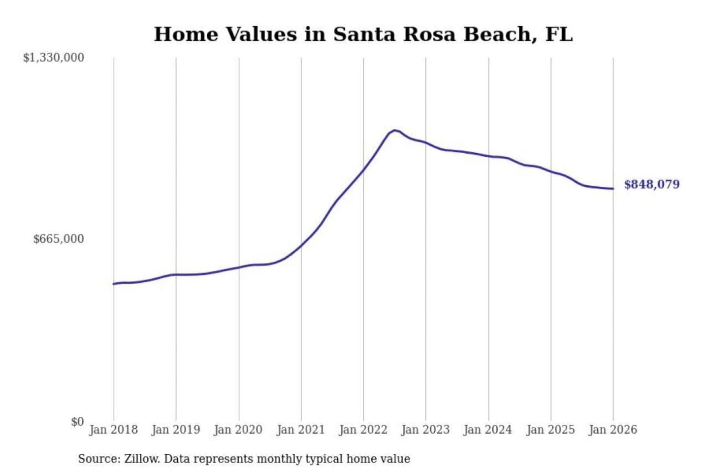 Stacker compiled a list of cities with the most expensive homes in the Crestview-Fort Walton Beach-Destin, FL metro area using data from Zillow. Charts show the monthly typical home value since January 2018.