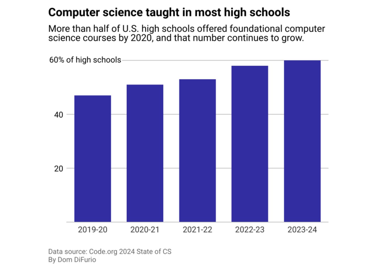 When the COVID-19 pandemic accelerated digital transformation, the demand for skilled workers in the tech fields rose even more, especially for those in computer science and coding. In 2024, 3 in 5 high schools offered foundational computer science courses, and 11 states required computer science credit for graduation, according to the latest annual report from advocacy group Code.org.
