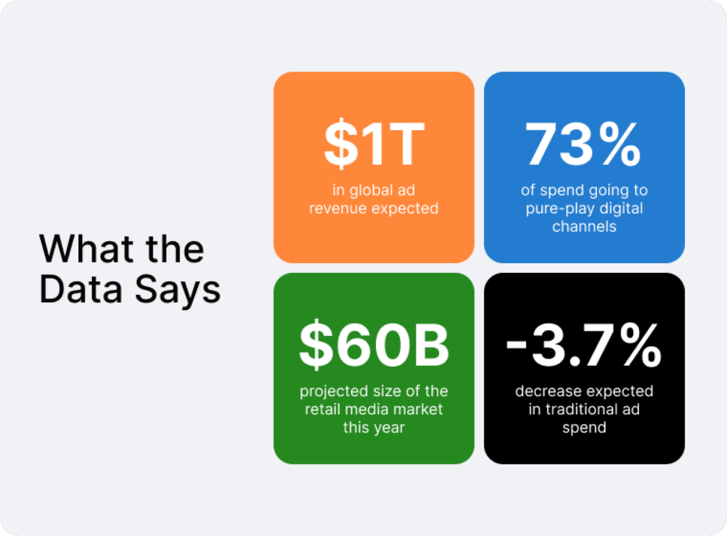 - Retail Media Networks. Brands are investing heavily in retail media (ads within e-commerce environments like Amazon, Walmart, and Target), which is estimated to hit $60 billion this year. Growth in retail media reflects evolving buyer behavior and the desire to reach consumers in purchasing moments.