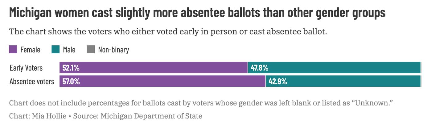More women voted early than men: Women made up 52% of the Michiganders who cast ballots that way in November. They also dominated absentee voting, accounting for nearly 57% of absentee voters in the general election.