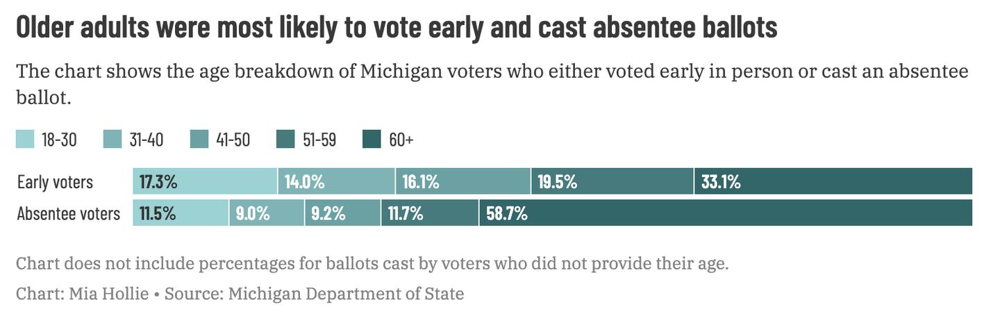 Nearly one in three early voters was age 60 or older, according to the Michigan Department of State, and more than half of early voters were at least 51 years old. That well outpaces the percentage of Michigan residents who are in that age group—Census data shows about 37.8% of Michiganians are in that age range.