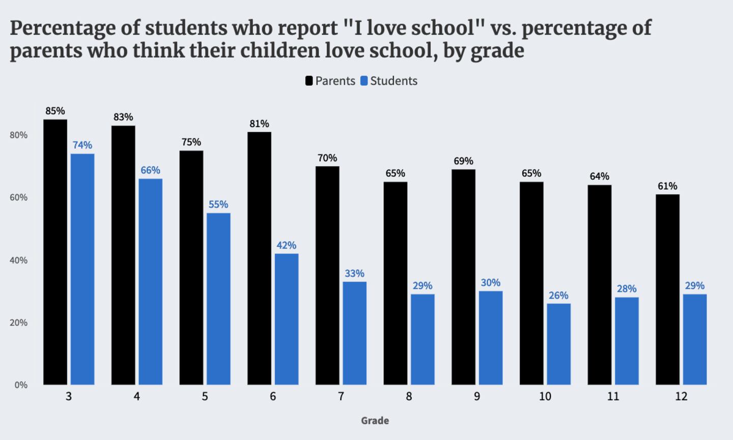 While higher percentages of parents always responded more positively to those questions than children, the gap in perceptions also grows significantly with the passage of time. By their freshman year, just 30% of students say they "loved" attending school; by contrast, nearly 70% of parents said they believed their kids loved their time in the classroom.