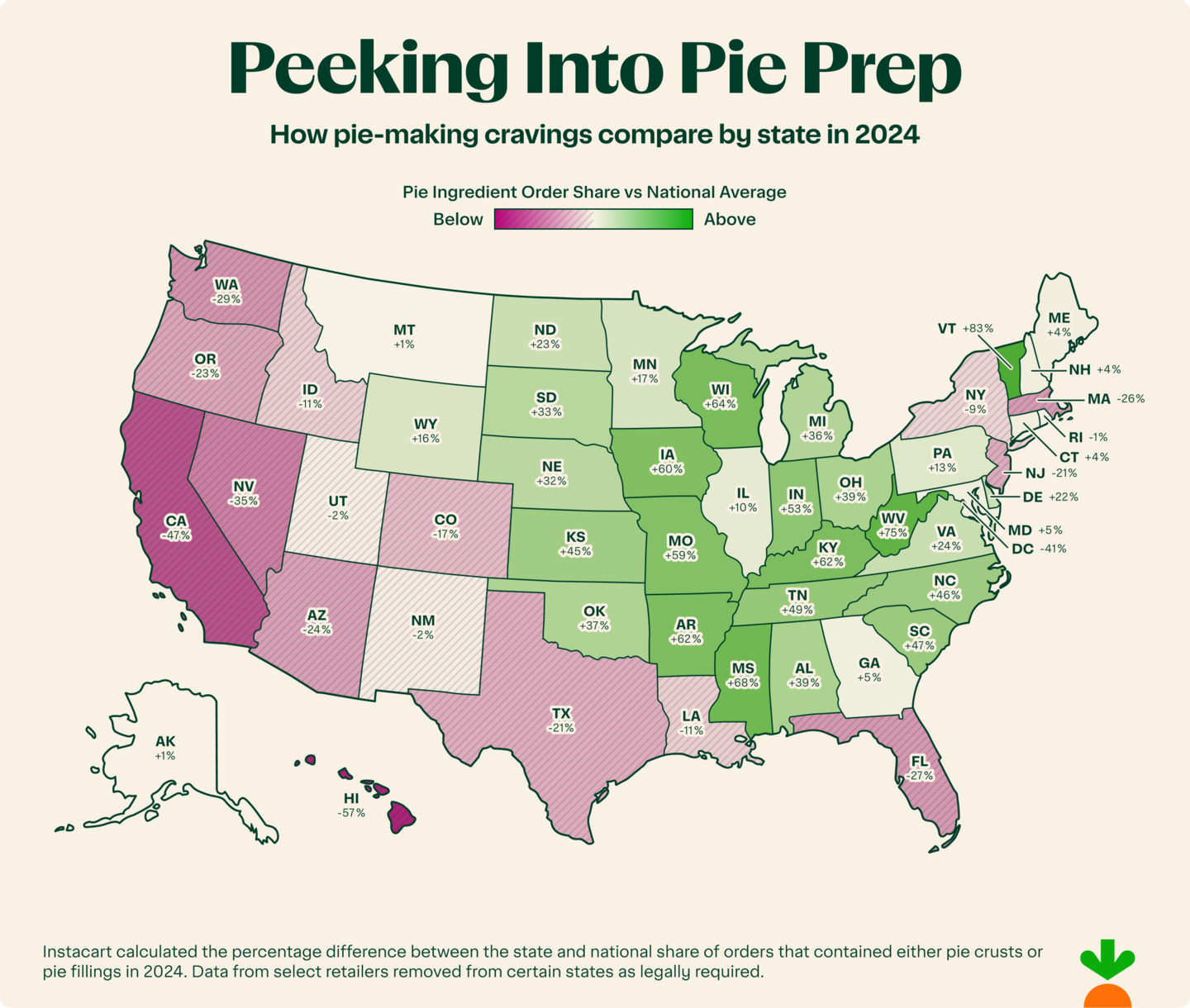 - Scratch-made love: Vermont led the charge, buying pie crusts and fillings 83% more often than the national average in 2024. West Virginia (75% more often), Mississippi (68%), Wisconsin (64%), and Kentucky (62%) also showed a strong appetite for pie-making essentials.