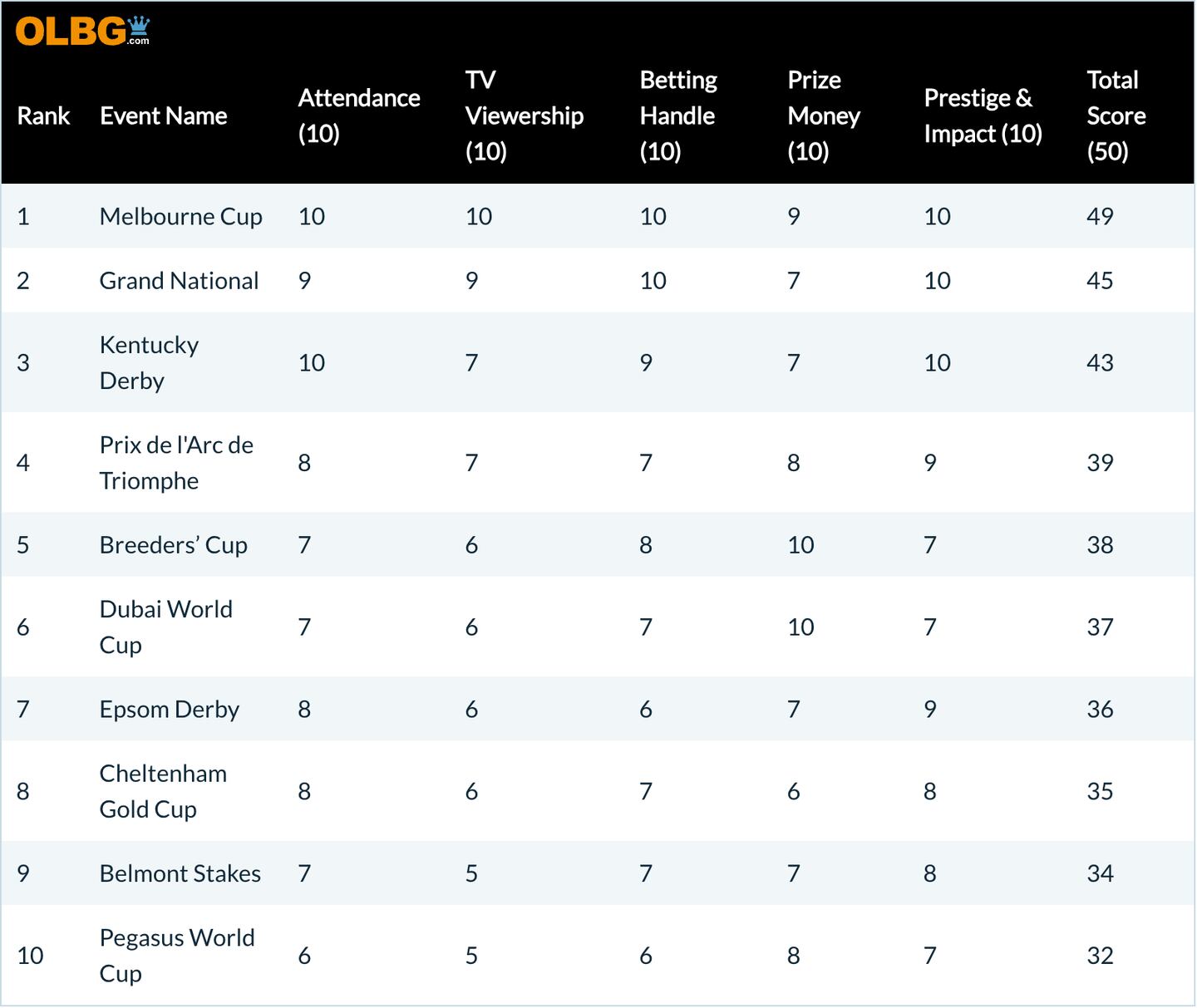 With maximum scores in four of the five categories, it was only prize money where the Melbourne Cup could arguably improve. Still, with it being such an overall sporting show, the ability to win the event outweighs the slight loss in potential earnings.