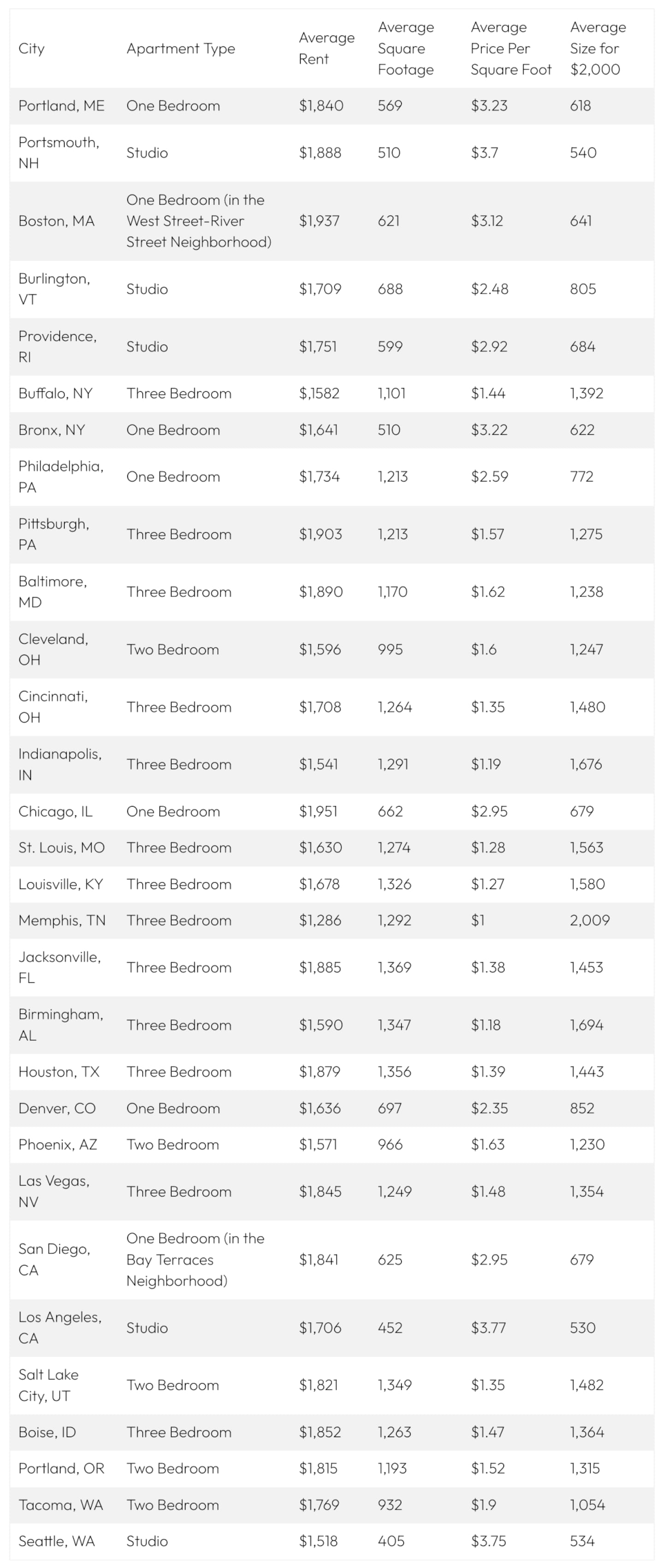 - Renters in smaller cities like Memphis, Buffalo, and Indianapolis can afford three-bedroom apartments within a $2,000 budget, while in big cities like Boston, Los Angeles, and Seattle, that same budget often only covers a studio.