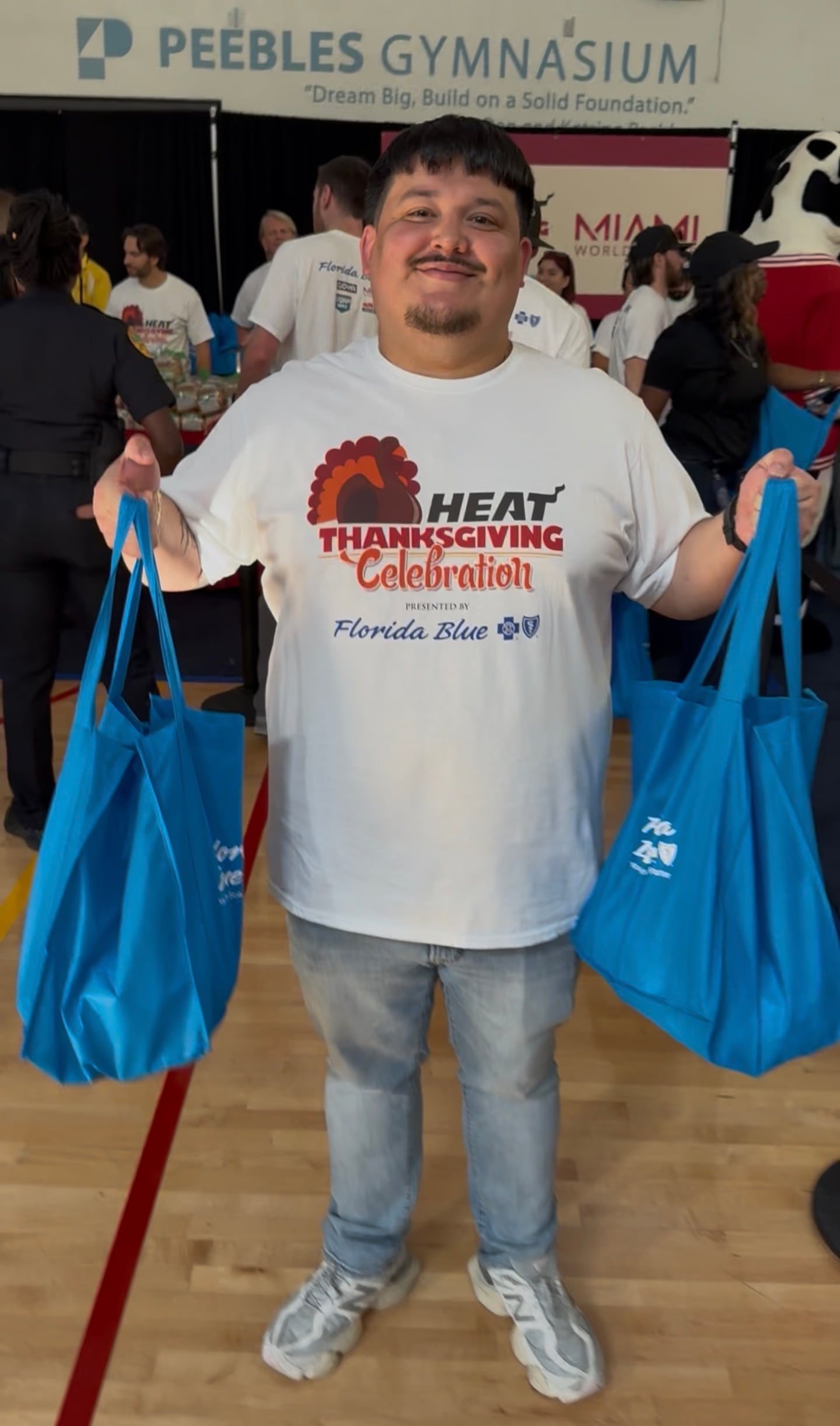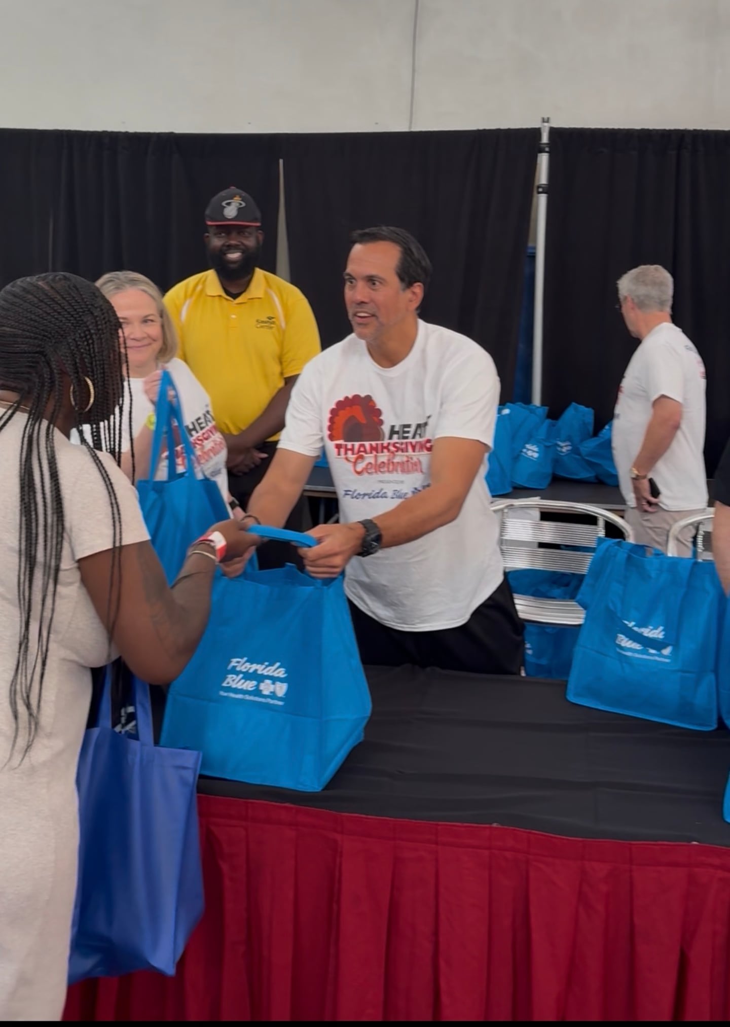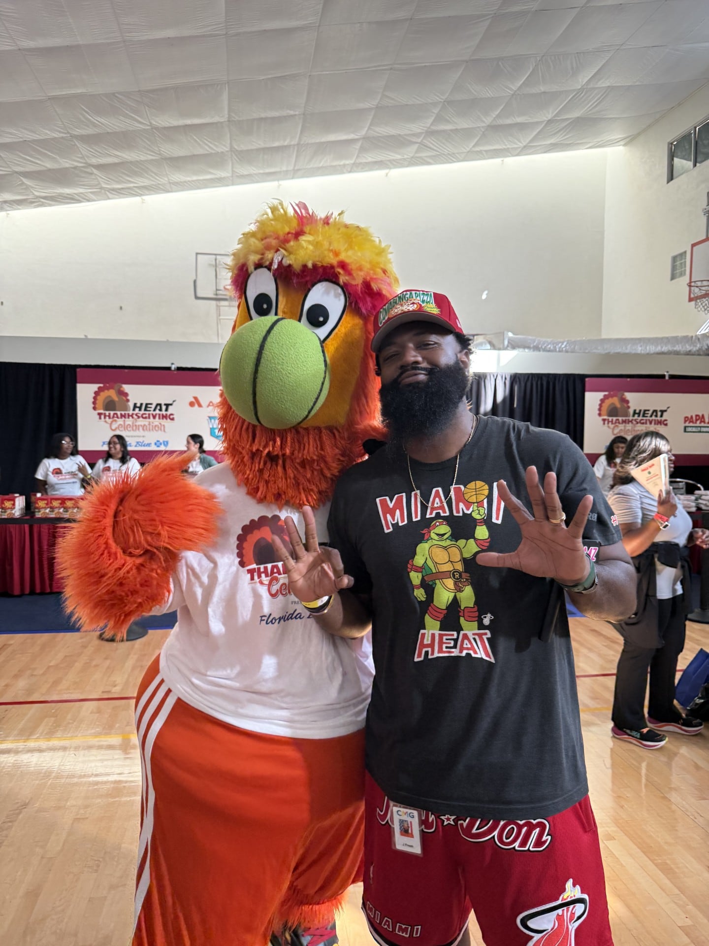 The Miami HEAT hosted their 34th Annual HEAT Thanksgiving Celebration, presented by Florida Blue at the Miami Rescue Mission on Tuesday November 18th, 2025. The HEAT Group, in collaboration with the Caring Place @ Miami Rescue Mission, Inc., tipped-off the Thanksgiving holiday with a block-party to help distribute approximately 600 Thanksgiving baskets to underserved families and provide hot meals to 450 residents of the Miami Rescue Mission, an organization that provides various services to the homeless and those in need throughout Miami-Dade County.